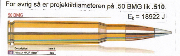 For øvrig så er projektildiameteren på .50 BMG lik .510. Så calibret er jo egentlig .51 eller 12.9mm. Videre så er den kinetiske energien med 0.05 kg projektil Ek = 18922 J